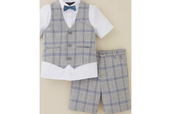 Eve and Milo Kids Check Shorts, Waistcoat, Short Sleeve Shirt and Tie Set Size & Fit Available in ages: 12-18 months to 9-10 years Click the Pick your age - more info link to view measurements Details Children's Check Shorts, Waistcoat, Short Sleeve Shirt and Tie Set by Eve and Milo Grey Stylish four-piece set for their dapper days, a perfect pick for a tailored look on weddings and special occasions Button-through smart check pattern waistcoat Cute breast pocket detail Welt pockets to the front Slick material to the back Matching shorts with handy slip pockets White shirt with short sleeves Collared neckline Easy-to-wear hook and loop fastening bowtie Crafted from comfortable fabric Material & Care Material Content: 1) W/C & PANTS: SHELL TBC; LINING 100%POLY;SHIRT: 60%COTTON, 40%POLY Washing Instructions: Machine Washable