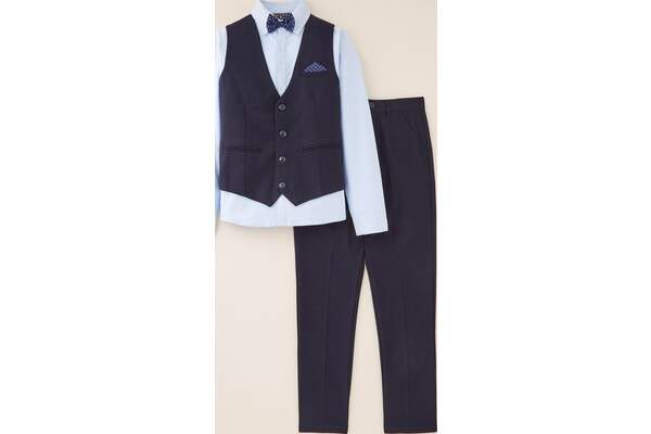 Eve and Milo Kids Trouser, Waistcoat and Shirt Suit Size & Fit Available in ages: 12-18 months to 13-14 years Click the Pick your age - more info link to view measurements Details Children's Trouser, Waistcoat and Shirt Suit by Eve and Milo Navy Dress your loved ones to impress in this sophisticated suit set, perfect for a special occasion! Four-piece waistcoat set Plain white shirt Collared neckline Button-through waistcoat Welt pockets to the front Matching trousers Easy-to-wear dot and diamond pattern bowtie Cute coordinated breast pocket detail Crafted from comfortable fabric Material & Care Material Content: Waistcoat: Front 72% Polyester 27%Viscose 1%Elastane - Back: 100%Polyester - Lining: 100%Polyester - Pants: 72%Polyester 27%Viscose 1%Elastane - Shirt: 100%Cotton Washing Instructions: Machine Washable