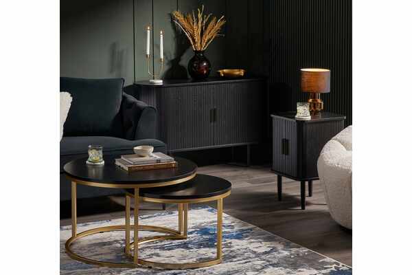 Chic and glamorous, the Kendall sideboard has a black ash wood effect finish and a sturdy metal frame. The eye-catching gold metal handles give this storage cabinet an added wow factor. Tambour doors elegantly slide open to reveal a storage space behind, making this sideboard a perfect addition to your living room or dining room to help you keep your belongings organised.