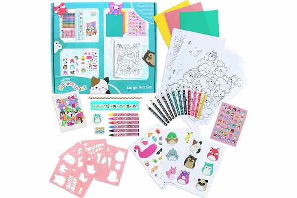 This large Squishmallows art set includes every colouring essential! Give your little Squish all of the tools they need to express themselves creatively. This large art set includes arts and crafts essentials from posters and colouring pencils to stickers and stencils. Whether taking inspiration from the included designs or coming up with their own, this set will bring out their inner Picasso. Contents: 10 x A4 colour by number posters 12 x colouring pencils 6 x crayons A5 sheet of 35 x character stickers 3 x sheets of coloured paper 3 x sheets of reusable stickers featuring over 40 x different characters and icons to cover the 2 x scenes inside 4 x card stencils including over 20 x different characters and symbols Pencil Eraser Ruler Sharpener A6 Scribble pad with 30 x sheets Depth: 30 MM Height: 330 MM Width: 280 MM Age Range: 3+ Warning Message: Warning: Not suitable for children under 3 years 135 piece set Doodle away in the A6 scribble pad containing 30 sheets Also contains an A5 sheet of stickers, 4 stencils and 3 sheets of reusable stickers This set includes a Pencil, Eraser, Ruler, Sharpener and 3 sheets of coloured card (Teal, Pink and Yellow) It has 10 A4 colour by number posters which you can colour in with the 12 colouring pencils and 6 crayons Official Squishmallows licensed product